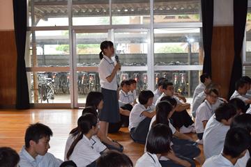 まず、5時間目に、2年生が5月に実施した修学旅行(台湾科学交流研修)の様子のプレゼンを1年生対象に行いました。英語の学習法や現地での過ごし方等、具体的なことまで教えてもらいました。