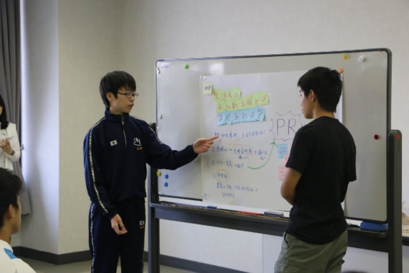また、現地実習ではNPO法人森からつづく道(松井宏光代表)の御指導のもと、本校を含めた県内外8校の生徒約20名がその風早地域の里山で生物調査を行い、「地域の生物多様性を保全するためにはどうしたらよいか」というテーマでワークショップを行いました。本校から参加した花岡龍之介君(209HR)は積極的に活動し、ワークショップでまとめを発表するなど活躍しました。